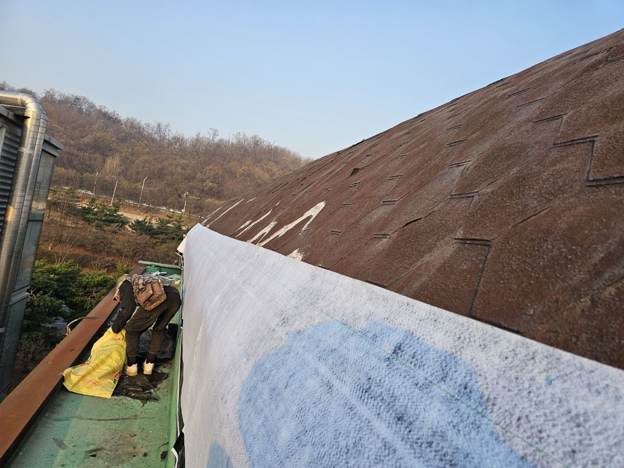 주택 지붕에 설치된 아스팔트슁글이 노후되어 방수시트