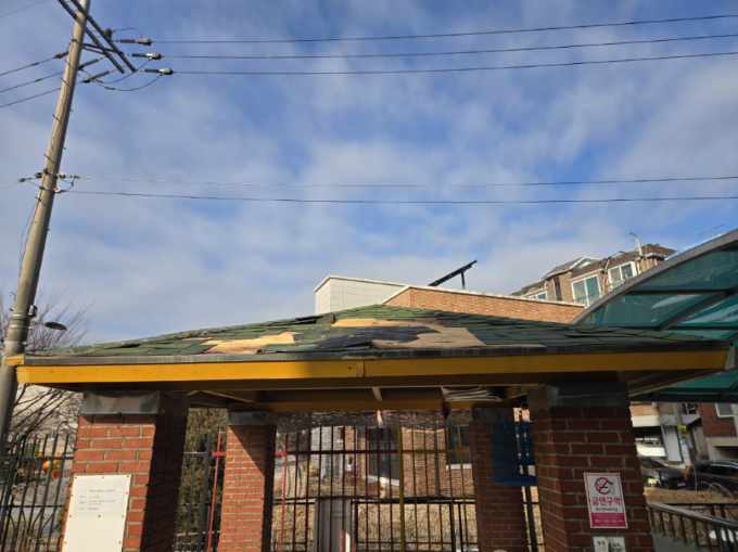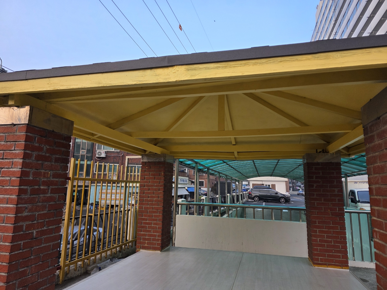 아파트쉼터에서 설치된 정자 우산각 구조물의 지붕이