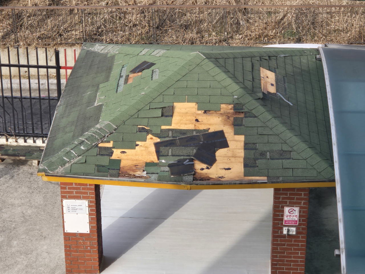 훼손되어 모두 철거하고 합판 후레슁카바 방수시트 아스팔트슁글