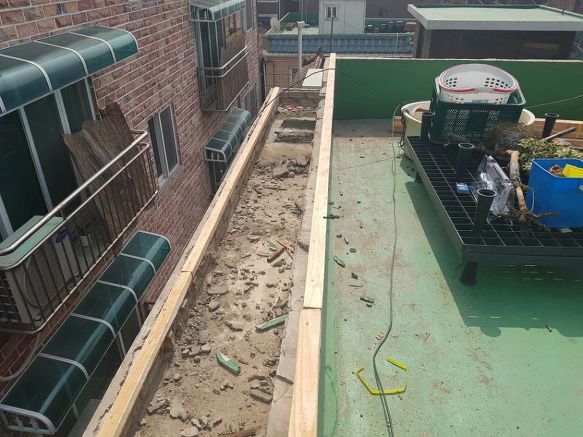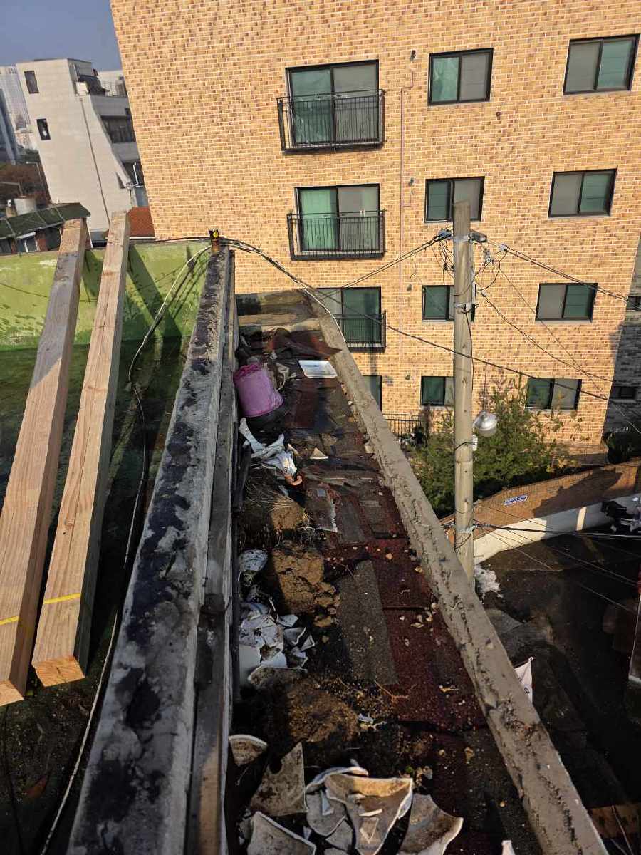 주택 옥상 난간 지붕에 설치된 아스팔트슁글을 철거하고