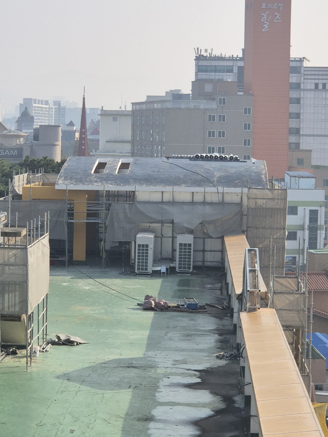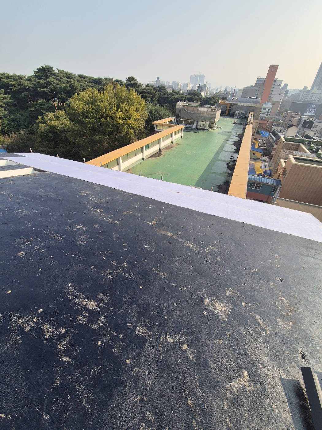 학교 건물 지붕에 누수가 발생하여 방수시트 시공후에
